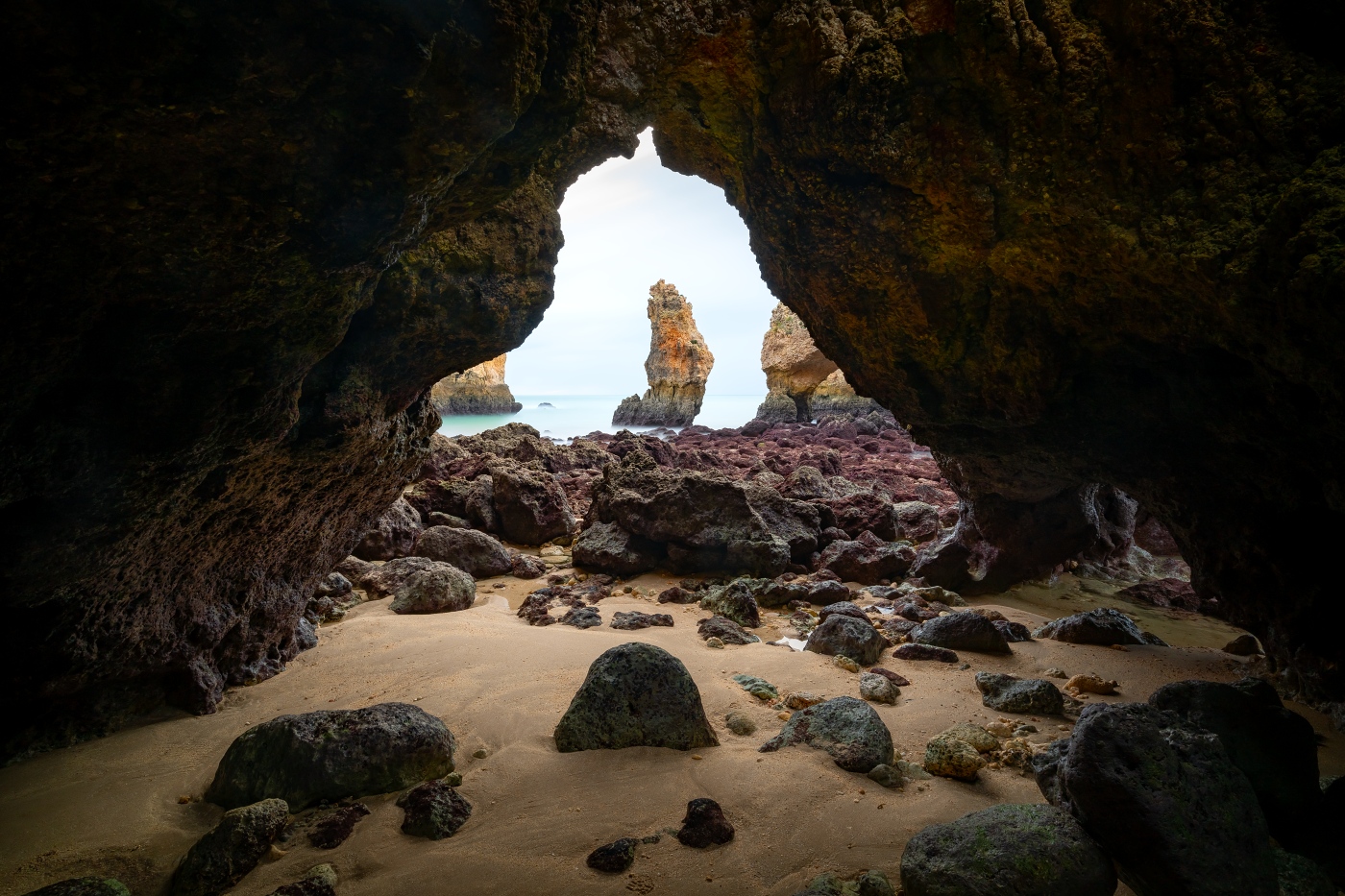 Proto je obzvláště skvělý ten okamžik, kdy se tenhle moderní stereotyp podaří nějak nabourat! Na pláž na úplném jihu Portugalska jsme dorazili právě v době nejvyššího odlivu a stačilo zdolat cca 2,5m vysokou skalní stěnu a já mohl objevovat malé jeskyně na pobřeží.