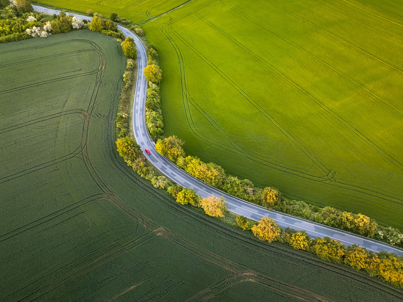 Zakroucená cestička v Moravském Toskánsku z ptačí perspektivy.